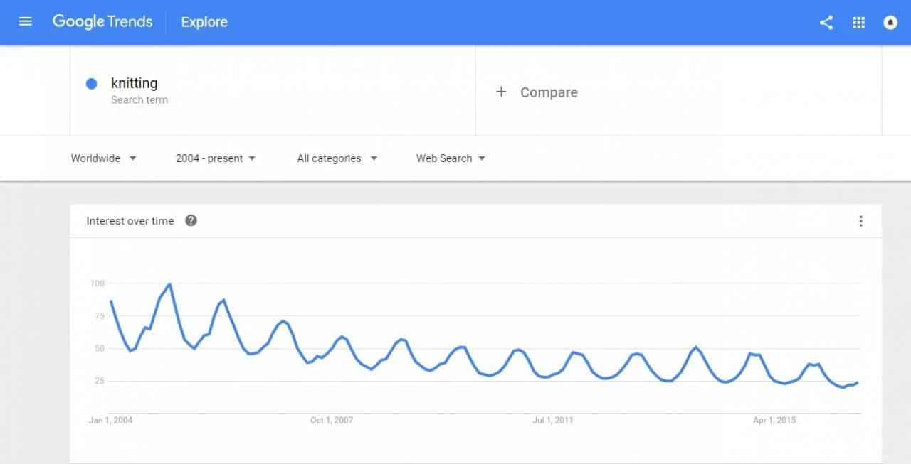 - ไปที่Google Trends และพิมพ์หมวดหมู่นี้ในฟิลด์ 'สำรวจหัวข้อ' ตัวอย่างเช่นลอง 'ถัก'